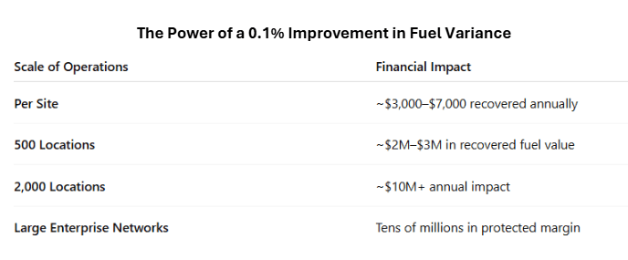A tenth of a percentage point improvement in fuel variance can translate into thousands of dollars in recovered value per location each year. Across large retail networks, those gains scale quickly, turning incremental improvements in detection and accountability into tens of millions of dollars in recovered fuel value annually. In an industry where fuel margins typically range between 3% and 5%, protecting even a small fraction of loss can have a meaningful impact on profitability.
